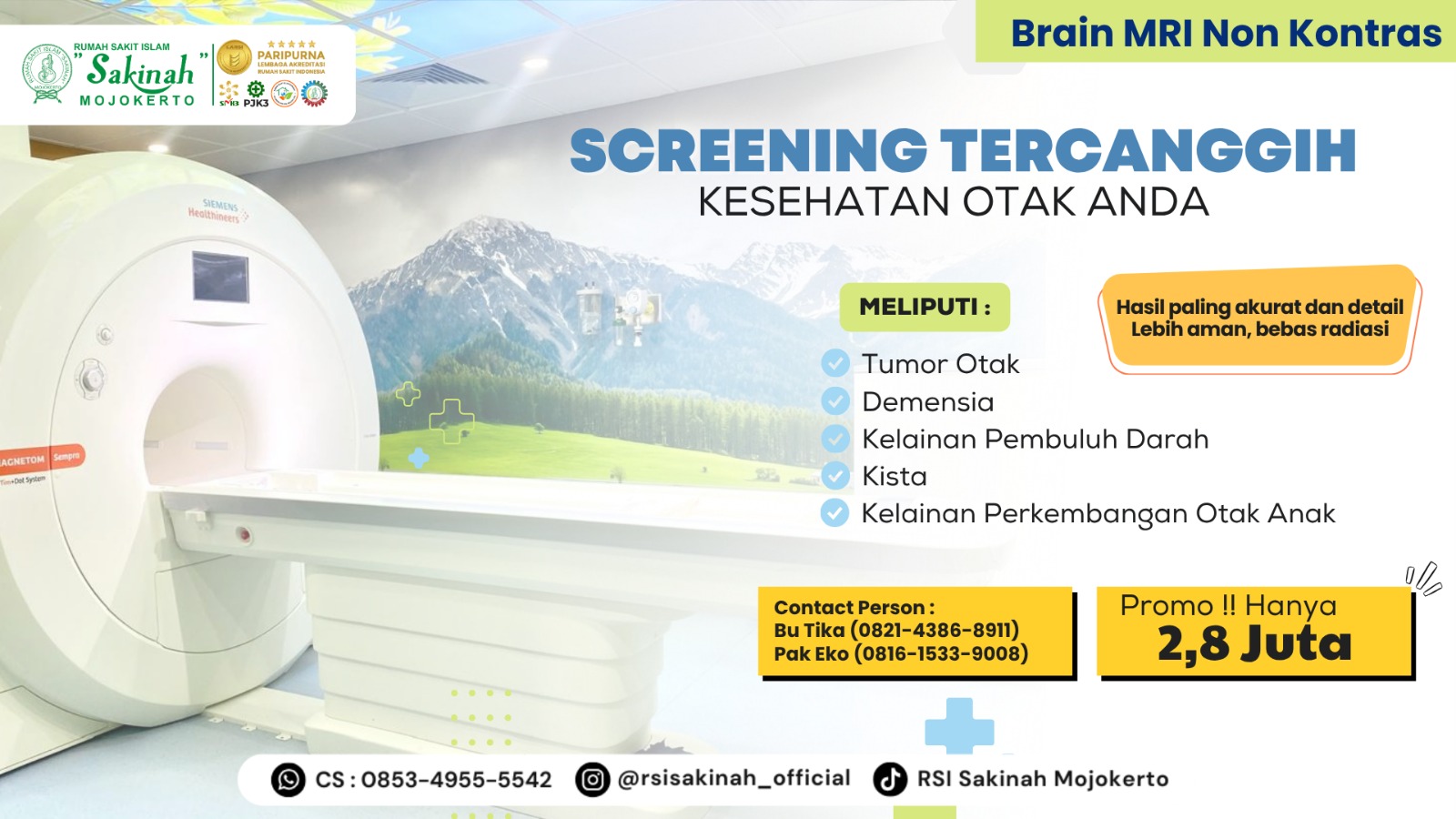 RSI Sakinah Mojokerto baru saja meluncurkan program layanan baru yaitu Brain MRI non kontras. Brain MRI (Magnetic Resonance Imaging otak) adalah pemeriksaan pencitraan otak yang menggunakan medan magnet dan gelombang radio untuk menghasilkan gambar detail struktur otak. Fungsinya antara lain: