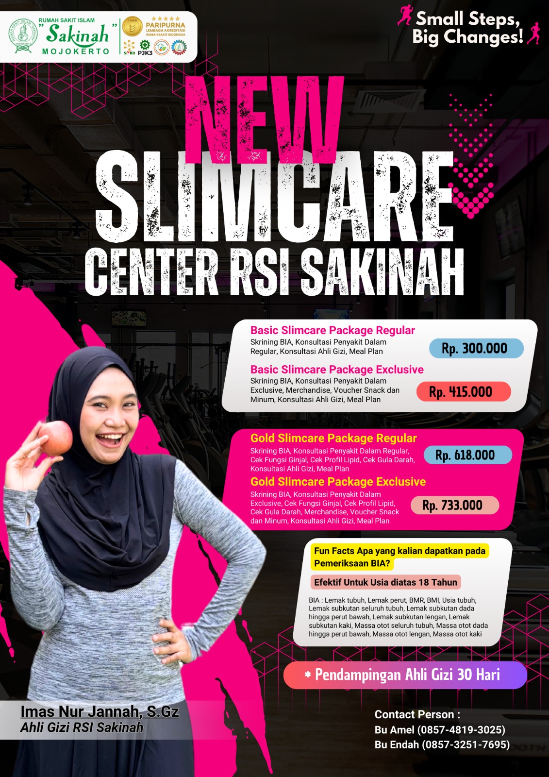 Rumah Sakit Islam Sakinah Mojokerto dengan bangga mengumumkan peluncuran program terbaru: SlimCare Center, sebuah layanan terpadu yang dirancang khusus untuk membantu masyarakat mencapai berat badan ideal dan hidup lebih sehat secara menyeluruh.